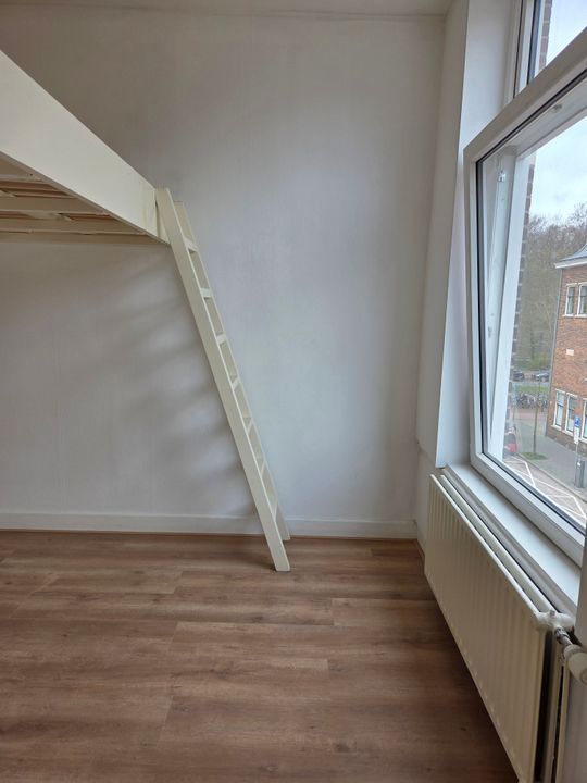 Gezamenlijke entree op de begane grond, trap naar de 2e etage, entree naar het appartement. U komt binnen in de woonkamer met open keuken. Vanuit de woonkamer heeft u toegang tot de slaapkamer met een vaste hoogslaper bedframe. De eigen prive badkamer en toilet bevindt zich op de overloop, deze hoeft NIET gedeeld te worden met andere personen.
